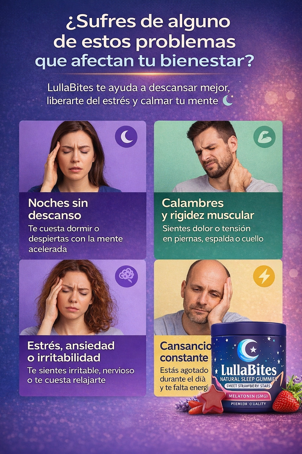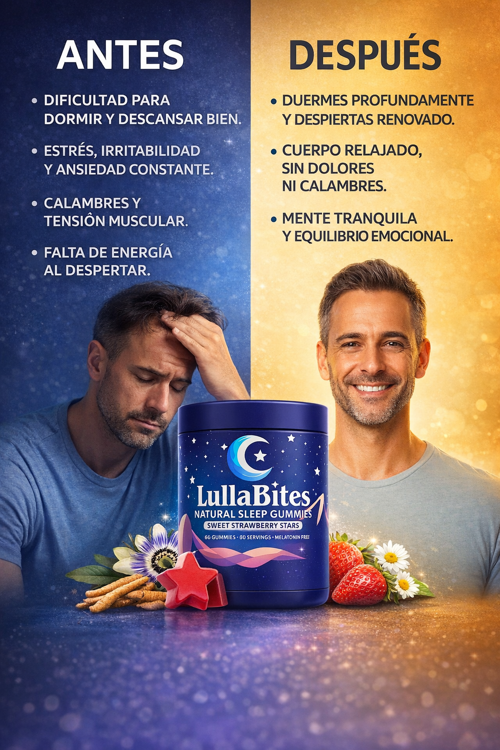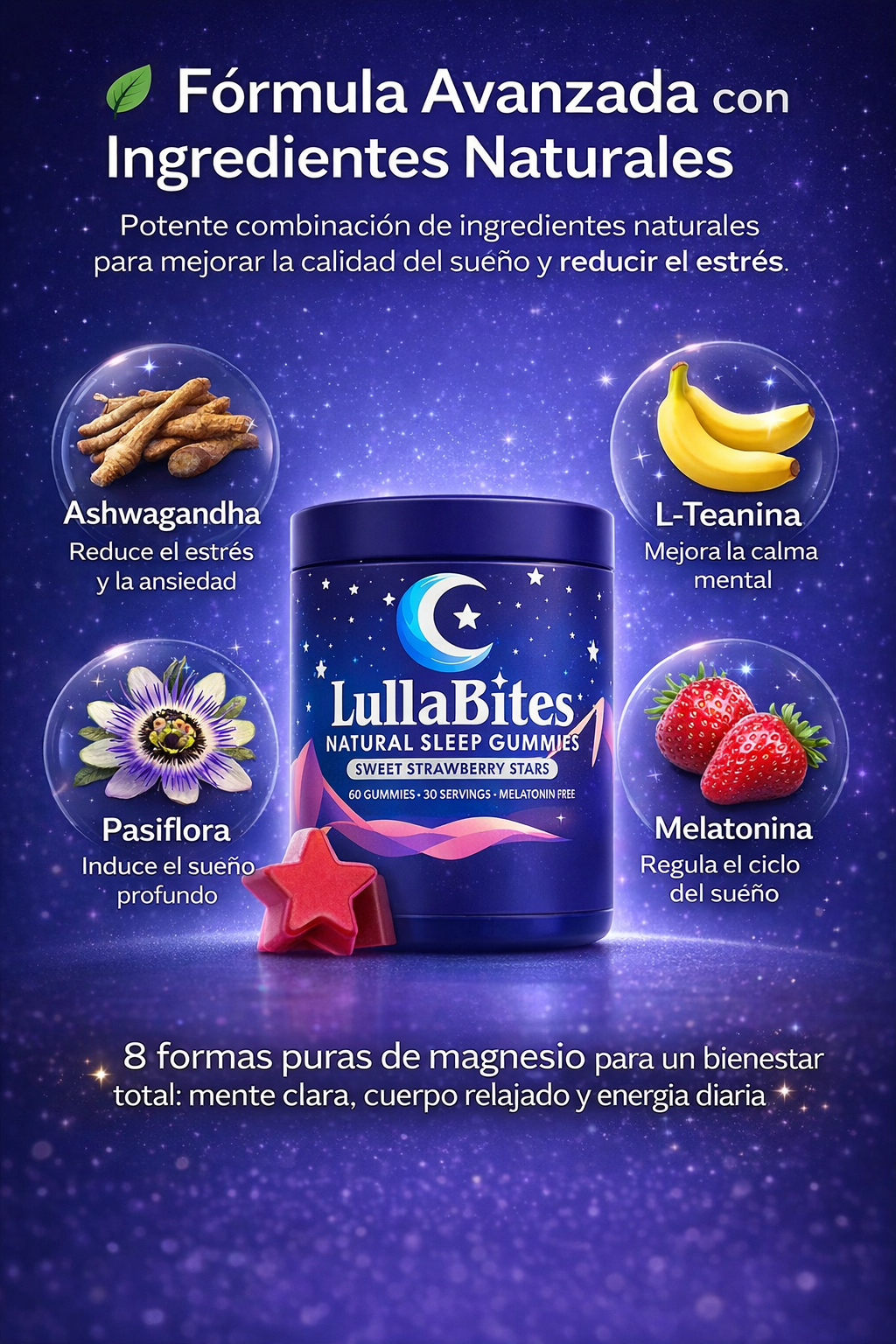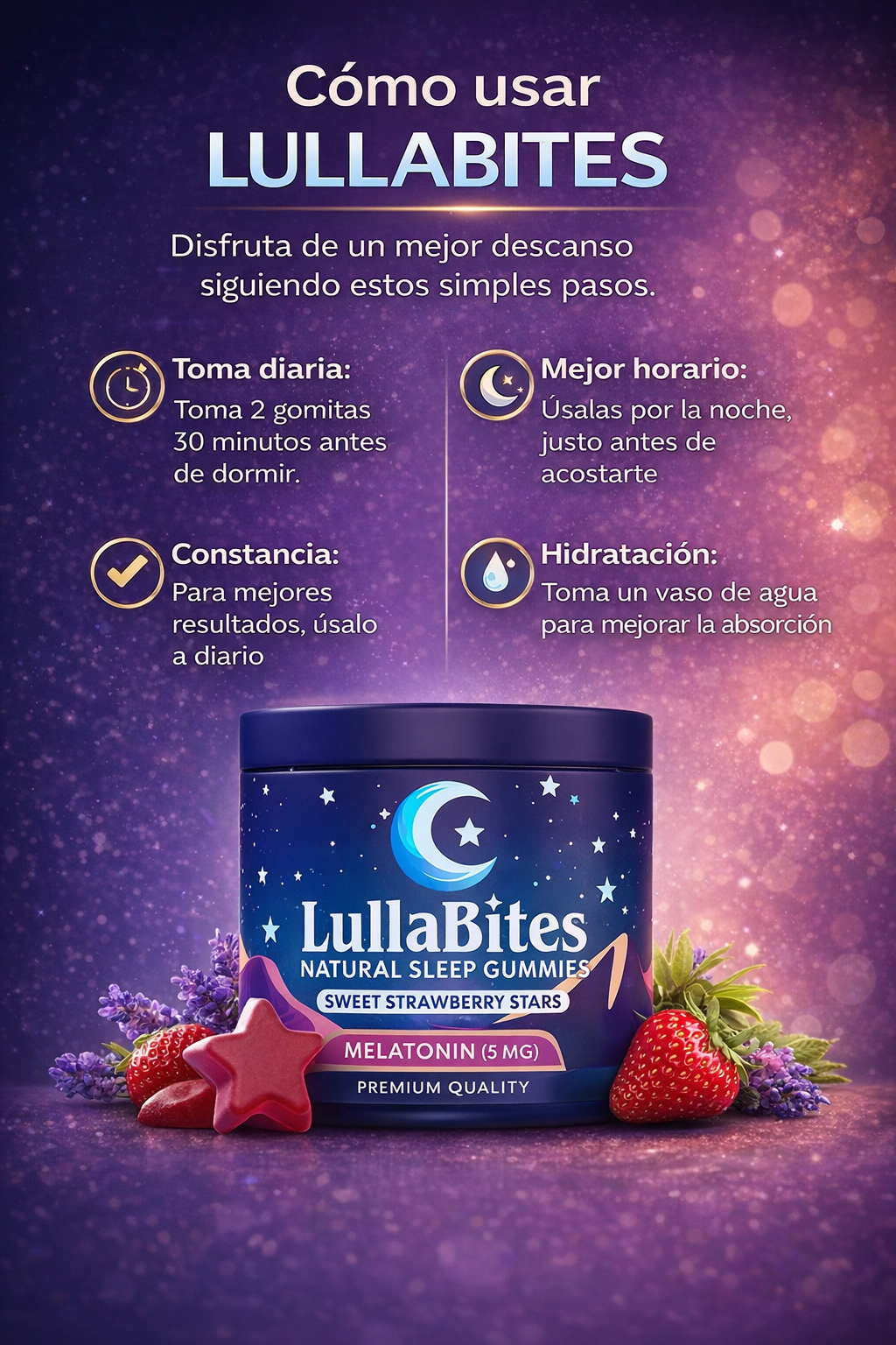 LullaBites es una fórmula en gomitas, creada para apoyar la relajación y ayudarte a establecer unarutina de descanso más tranquila, de forma natural y fácil de tomar.
